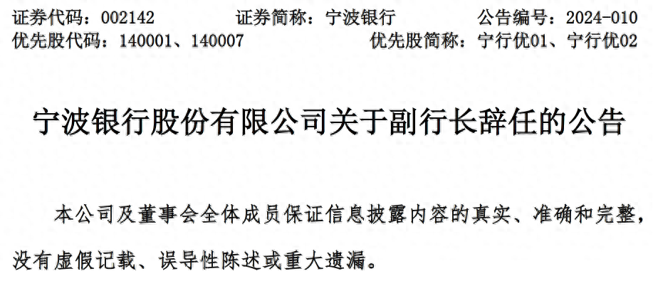 宁波银行(002142)发布公告称,近日,宁波银行股份有限公司(以下简称“公司”)董事会收到公司副行长章宁宁女士的书面辞呈。因个人原因,章宁宁女士辞去公司副行长职务,自 2024 年 2 月 6 日起生效。章宁宁女士辞任后,不再担任公司及控股子公司任何职务。章宁宁女士确认与公司董事会无不同意见,亦无其他事项需要通知公司股东。截至本公告日,章宁宁女士未持有公司股份。