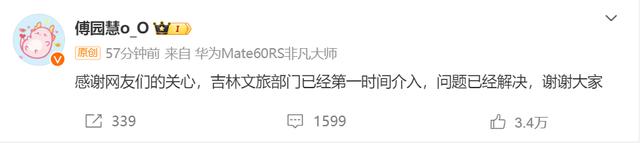 2月17日10时56分,傅园慧再次发文:感谢网友们的关心,吉林文旅部门已经第一时间介入,问题已经解决,谢谢大家 。