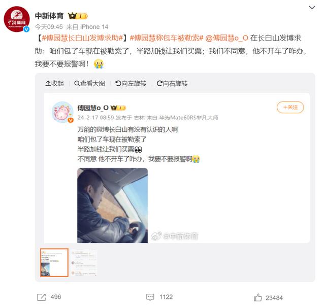 2月17日一早,游泳运动员傅园慧在长白山发微博求助:“咱们包了车现在被勒索了,半路加钱让我们买票;我们不同意,他不开车了咋办,我要不要报警啊!”