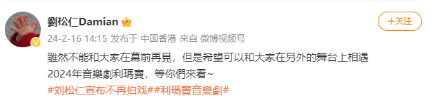 2月16日下午,香港知名老戏骨刘松仁在个人微博上承认,自己将“不再拍戏”。