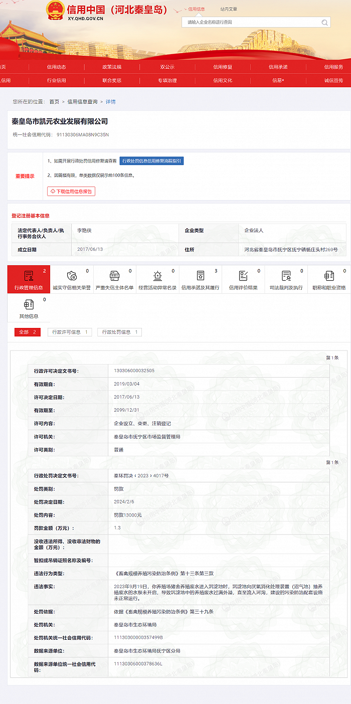 据信用中国(河北秦皇岛)门户网站显示,秦皇岛市凯元农业发展有限公司在2023年9月19日,养殖场猪舍养殖废水进入沉淀池时,沉淀池向厌氧消化处理装置(沼气池)抽养殖废水的水泵未开启,导致沉淀池中的养殖废水过满外溢,直至流入河沟,建设的污染防治配套设施未正常运行。违反了《畜禽规模养殖污染防治条例》第十三条第三款。