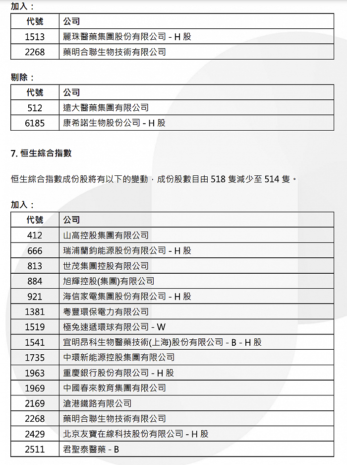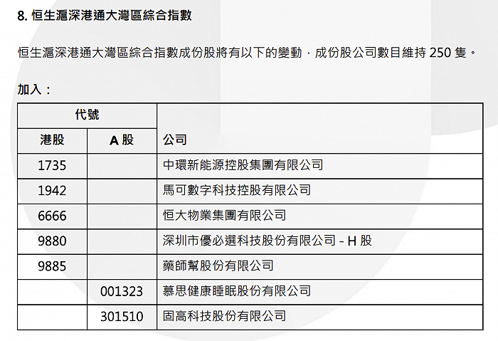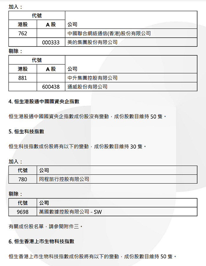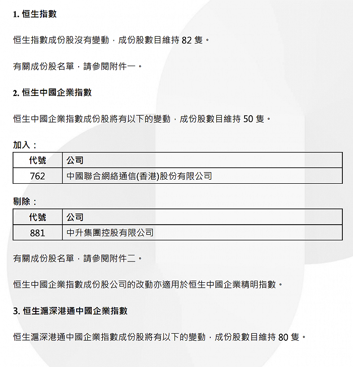 2月16日,恒生指数有限公司宣布,截至2023年12月31日之恒生指数系列季度检讨结果,所有变动将于2024年3月4日(星期一)起生效。恒生指数成份股没有变动,成份股数目维持82只。