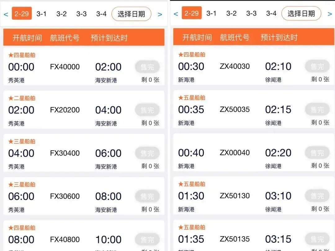 2月15日凌晨,“琼州海峡轮渡管家”平台搜索显示,2月15日至29日,秀英港和新海港的新能源车出岛船票基本售罄,3月1日及之后的航班暂未开始预售。而燃油车出岛船票在2月15日至21日也基本售罄,2月22日及之后则余票充足。