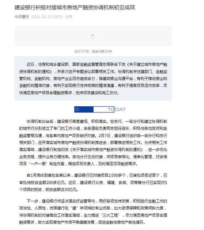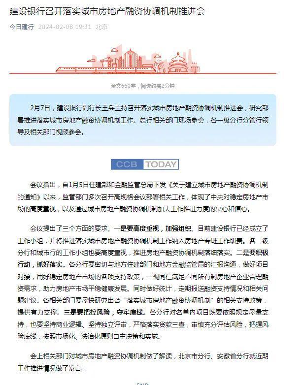 建行官方微信号2月8日发布消息称,2月7日,建设银行副行长王兵主持召开落实城市房地产融资协调机制推进会,研究部署推进落实城市房地产融资协调机制工作。总行相关部门现场参会,各一级分行分管行领导及相关部门视频参会。