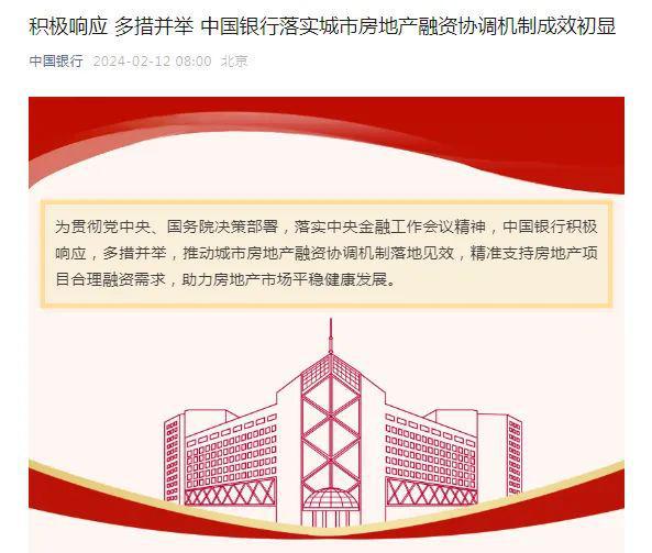 中国银行官方微信号2月12日发布消息称,城市房地产融资协调机制建立后,该银行已成立工作专班,统筹落实全行做好协调机制相关工作。从提供支持政策、满足合理融资需求、做好业务管理、建立专项统计监测、保持内外沟通、稳定市场预期等七个方面,出台15条具体措施。