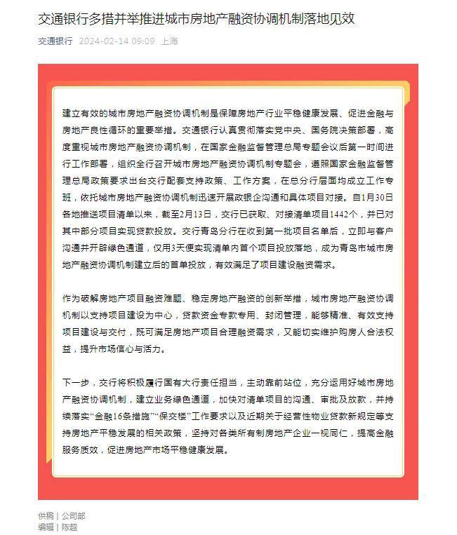 交通银行官方微信号2月14日发布消息称,该行第一时间进行工作部署,组织全行召开城市房地产融资协调机制专题会,遵照国家金融监督管理总局政策要求出台交行配套支持政策、工作方案,在总分行层面均成立工作专班,依托城市房地产融资协调机制,迅速开展政银企沟通和具体项目对接。