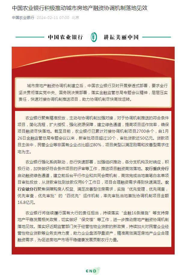 农业银行官方微信号2月11日发布消息称,该行聚焦精准投放,主动与协调机制加强对接,对于协调机制推送的符合条件项目,简化流程,扩大授权,强化资源保障,建立绿色通道,提高项目运作效率,确保项目融资尽快落地。
