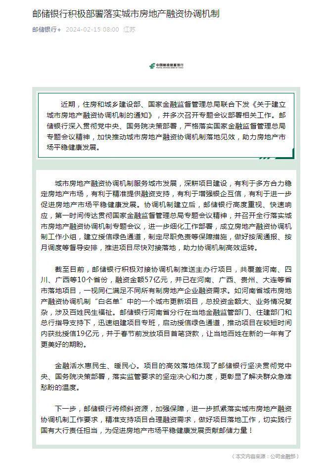 邮储银行官方微信号2月15日发布消息称,协调机制建立后,邮储银行召开全行落实城市房地产融资协调机制专题会议,进一步细化工作部署,成立房地产融资协调机制工作小组,建立授信绿色通道,制定尽职免责等保障措施,做好按周通报、按月调度等督导安排,推进项目尽快对接落地,助力协调机制高效运转。