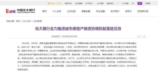 根据光大银行于2月14日发布的消息,2月7日,光大银行召开全行落实城市房地产融资协调机制专题会议,对推进工作进行再动员、再部署。截至2月9日,光大银行39家一级分行全部组建工作专班,并和当地住建部门实现对接,共获取项目名单2622个,对符合条件的项目给予资源保障,建立绿色通道,已获批名单内项目20个,授信金额达107.5亿元,贷款余额达50.14亿元,助力协调机制高效运转。