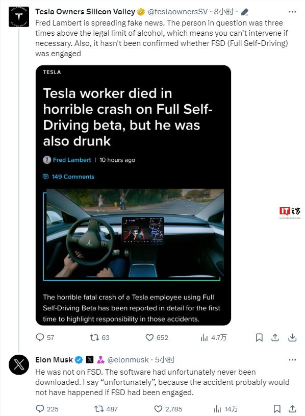 对此争议事件,特斯拉 CEO 埃隆・马斯克在 X 平台进行了回应,表示该员工没有开启 FSD,甚至那辆车也没有下载过 FSD 软件。