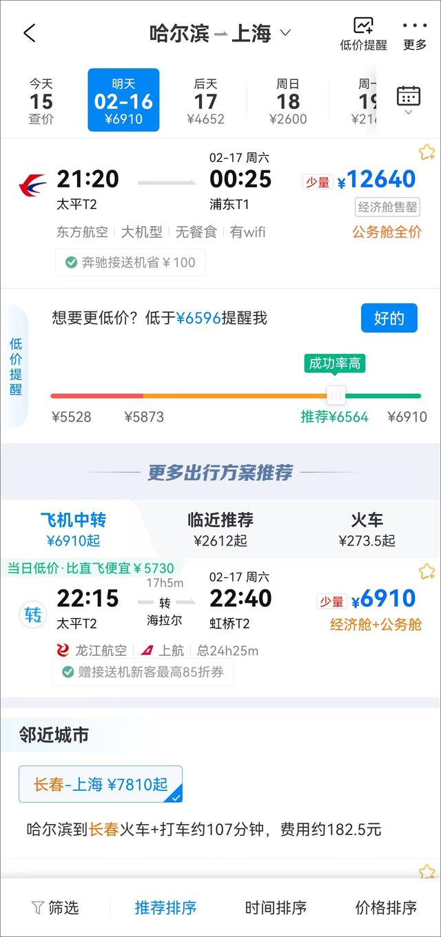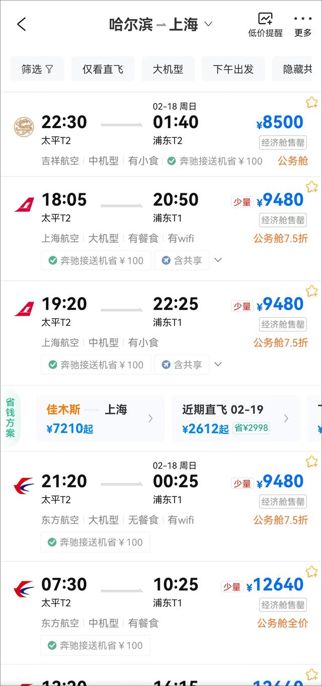 而目前能够购买的最近一班哈尔滨直飞上海的航班为2月16日,经济舱均已售罄,公务舱价格为12640元。2月17日,哈尔滨返沪的经济舱机票也已售空,公务舱价格从8500元至12640元不等。