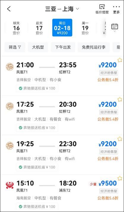 相关旅游平台显示,目前能够购买的三亚直飞上海最近一班航班日期为2月18日,经济舱均已售罄,公务舱最低价格为9200元。
