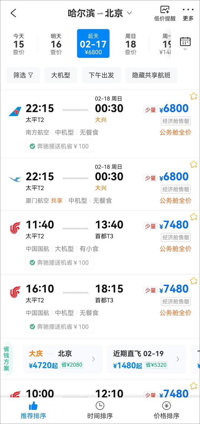 此外,目前可购买的哈尔滨直飞北京的最近一班航班为2月17日,经济舱已售罄,公务舱价格最低为6800元。