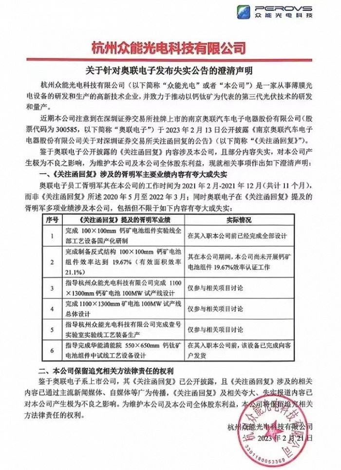 公告所称的“指导”仅指胥明军曾对项目提出了建议,并未发挥关键核心技术或者重大工艺的指导作用。如项目3“指导华能清能院550×650mm钙钛矿电池组件中试线工艺设备设计”中,中国华能集团清洁能源技术研究院有限公司(以下简称华能清能院)研发团队根据中试线工艺技术需求,自主提出系统工艺设计及相关设备的基本功能和参数;杭州众能光电科技有限公司(以下简称杭州众能) 按照要求提供了部分设备,胥明军仅参与杭州众能的内部人员统筹、进度跟踪等工作。项目4“指导华能清能院550×650mm钙钛矿电池组件中试线效率验收达标” 中,组件研发和效率提供过程均由华能清能院钙钛矿研发团队完成,设备供货厂商杭州众能提供设备运行维护和保障,胥明军未到华能清能院现场参与相关工作。2023年2月21日,华能清能院发布了《关于针对奥联电子发布失实公告的澄清声明》(以下简称《澄清声明》),声明不存在“指导华能清能院550×650mm钙钛矿电池组件中试线效率验收达标,最高认证效率达到16.8%”等相关事实。