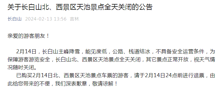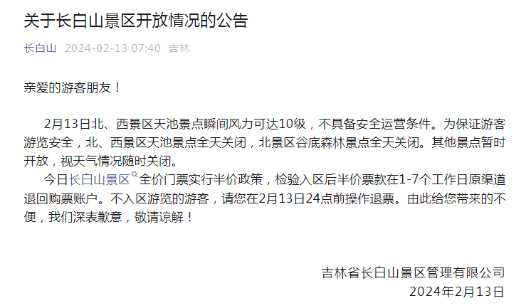 2月13日早上,吉林省长白山景区管理有限公司通过官方微信公众号发布《关于长白山景区开放情况的公告》。公告称,长白山部分景点关闭,当日长白山景区全价门票实行半价政策。
