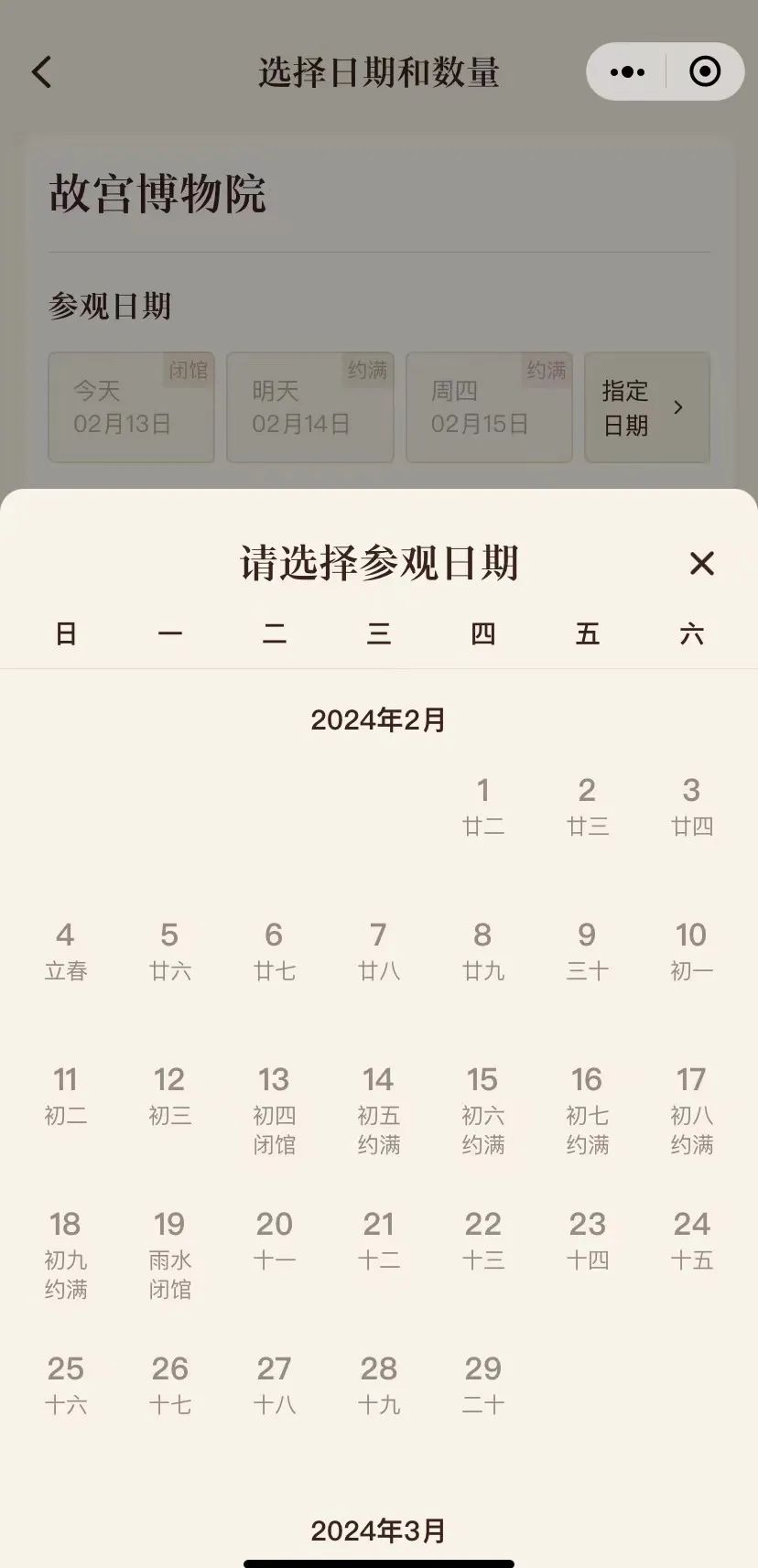 故宫博物院门票预约小程序显示,2月14日(初四)至18日(初九)门票已经全部约满。
