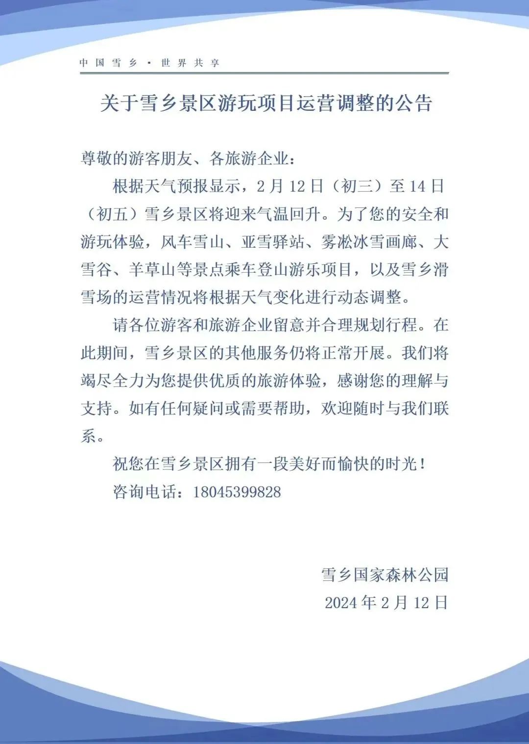 2月12日(初三)至14日(初五),雪乡景区将迎来气温回升。为了保障游人安全和游玩体验,风车雪山、亚雪驿站、雾凇冰雪画廊、大雪谷、羊草山等景点乘车登山游乐项目,以及雪乡滑雪场的运营情况将根据天气变化进行动态调整。