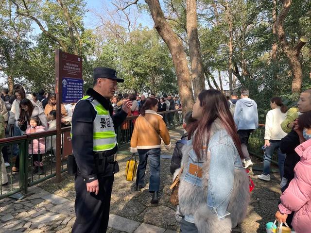 三潭印月岛不大,沿湖走一圈大概960米。这么小的地方,春节期间日均游客量能达到5万左右,顶峰时曾达到7万人。因大流量而来的秩序维护、咨询求助、反诈宣传、纠纷化解等压力,不言而喻。