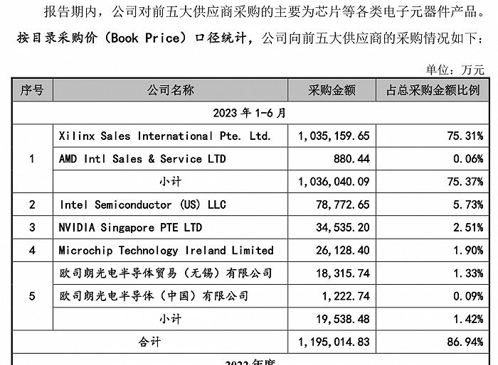 界面新闻注意到,无论是按照目录采购价(Book Price)口径统计,还是按扣除当期采购金额中包含的返利后的实际采购金额口径统计,科通技术对海外国际原厂具有一定依赖性。比如第一大供应商Xilinx(赛灵思),对其2023年上半年的采购金额占比为75.31%(不扣除)和16.07%(扣除)。