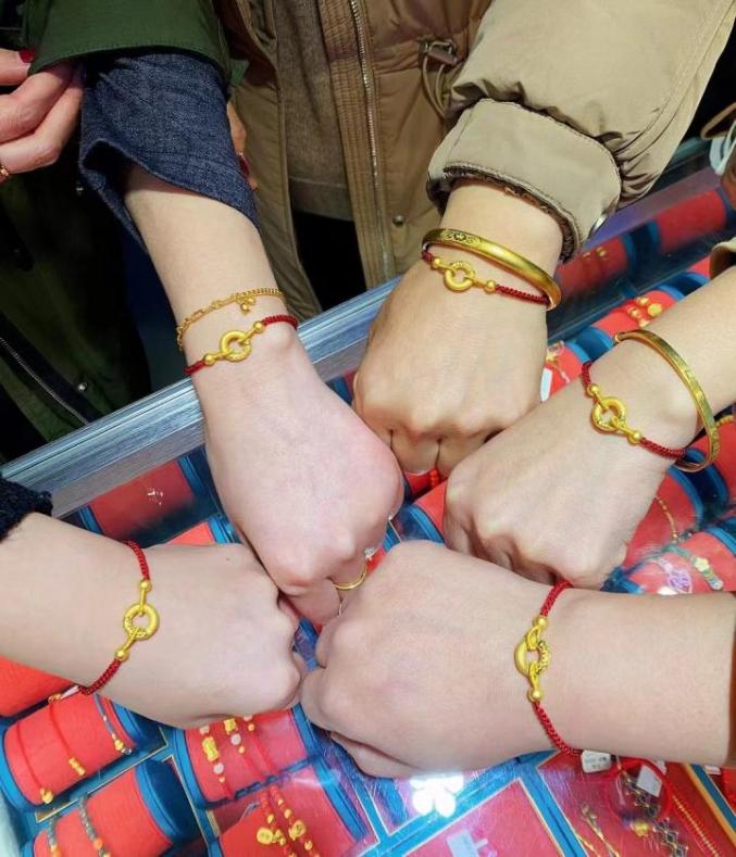 在她们买金的同时,店里不断有客人进来、成交,有人买龙年生肖金饰,有人买金手镯。一旁的老板娘岚岚告诉记者,这几天太忙了,每天从早上9点忙到夜里10点,前一天连中饭和晚饭都没空吃,“特别是那些要给金饰编绳的客人,每天都要排队,有些客人排队都超过两小时。”