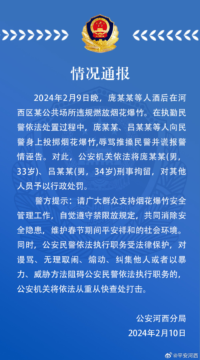 2024年2月9日晚,庞某某等人酒后在河西区某公共场所违规燃放烟花爆竹。在执勤民警依法处置过程中,庞某某、吕某某等人向民警身上投掷烟花爆竹,辱骂推搡民警并谎报警情诬告。对此,公安机关依法将庞某某(男,33岁)、吕某某(男,34岁)刑事拘留,对其他人员予以行政处罚。