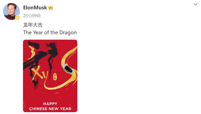 大年初一(2月10日),特斯拉CEO埃隆·马斯克在微博发文,并配有一张特斯拉海报,祝贺大家龙年大吉。
