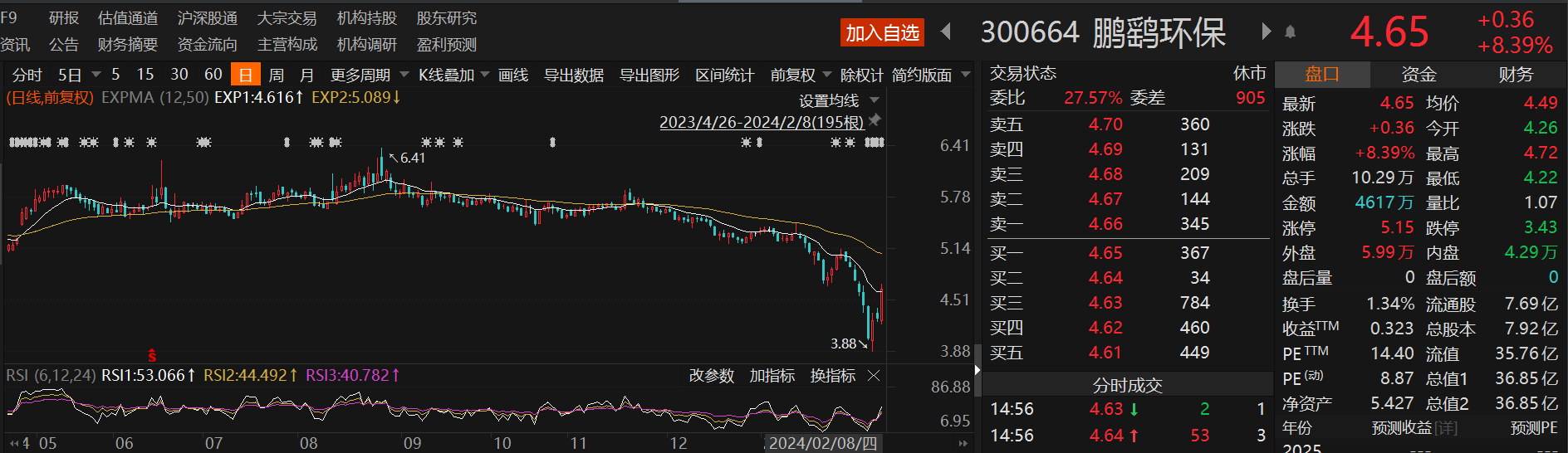 二级市场上,鹏鹞环保股价自2020年阶段高点迄今累计最大跌幅达57.58%,近期一度创出3.88元/股的历史新低。