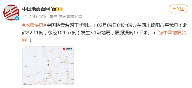 据中国地震台网中心官方微博消息,中国地震台网正式测定:2月9日04时09分在四川绵阳市平武县(北纬32.11度,东经104.57度)发生3.1级地震,震源深度17千米。