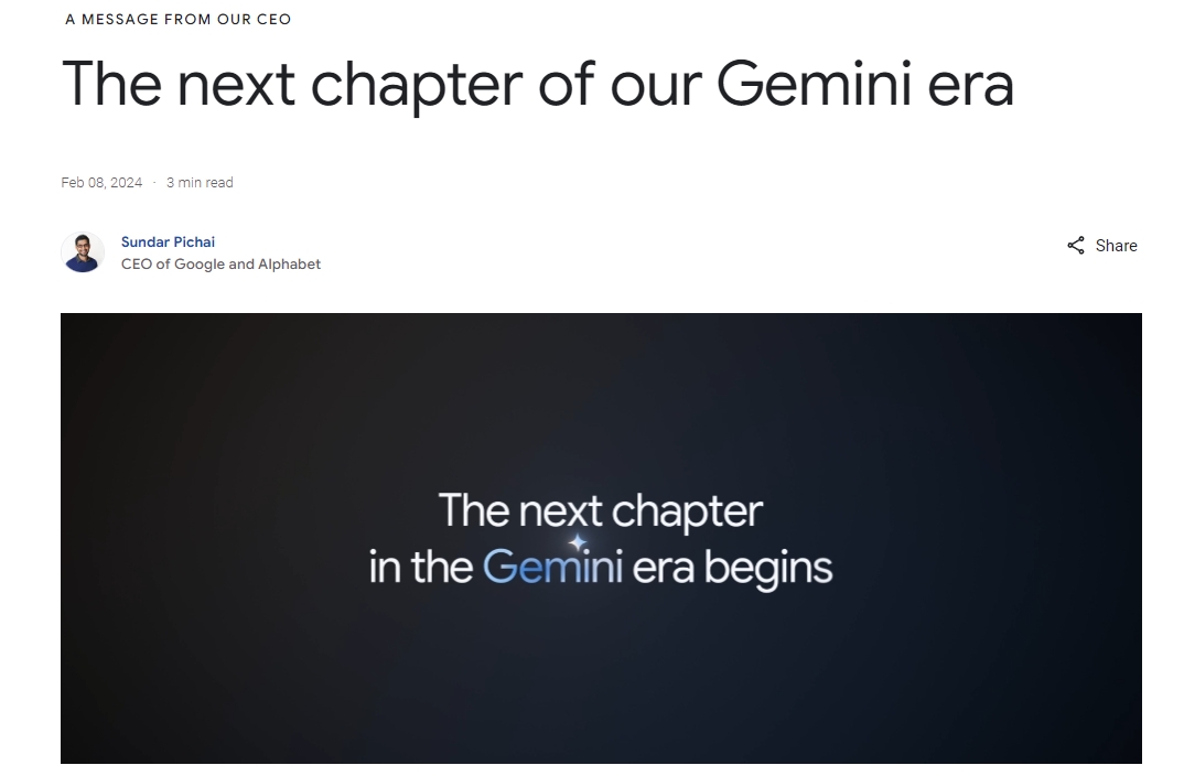 先把不那么重要的事情一笔带过。谷歌周四宣布,从今天开始公司旗下的Bard聊天机器人更名为Gemini,也就是这个机器人背后大模型的名字,这也意味着Bard这个品牌上线整一年后完成了历史使命。另外,谷歌也在应用市场中推出Google Gemini(安卓),苹果用户则能在搜索应用中用上移动端的Gemini。