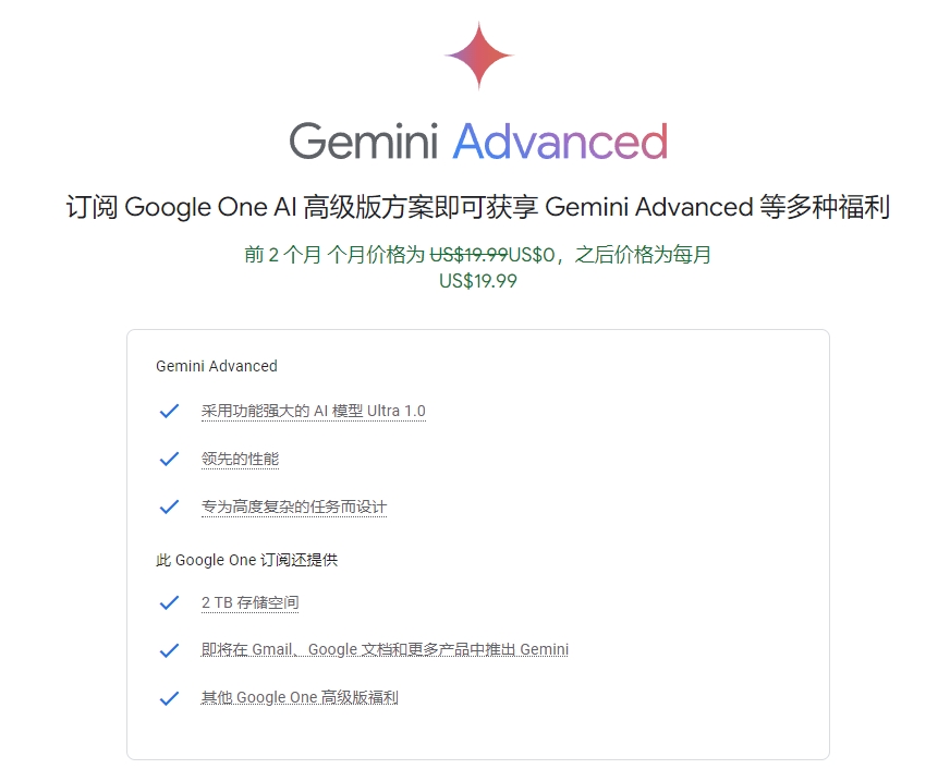 在今天之前,Google One订阅主要是花钱买不同档次的在线存储空间(100GB或2TB),再附加一些诸如照片编辑、在线会议等功能,收费为每月1.99美元和9.99美元。而AI功能直接将订阅服务的上限拉了一倍——Google One AI高级版的订阅费用为19.99美元/月,恰好比ChatGPT Plus便宜了1分钱。