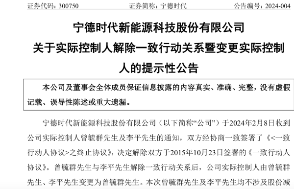 2月8日晚间,全球动力电池龙头宁德时代发布重磅公告称,已收到公司实际控制人曾毓群及李平的通知,双方经协商一致签署了《<一致行动人协议>之终止协议》,决定解除双方于2015年10月23日签署的《一致行动人协议》。