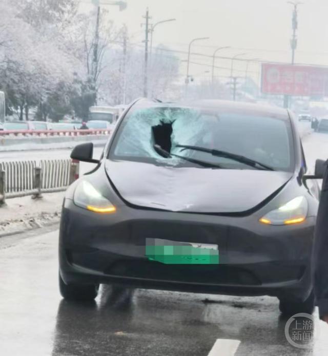 一位发布视频的车主告诉上游新闻记者,桥上铁索掉下冰柱,多辆车被砸引发交通堵塞。另一位车主称,自己的车排在第一个等放行,看到被砸的电动车掉头下桥,过了20分钟,后面一声巨响,回头一看,紧挨着的后面一辆的车驾驶舱也整个被砸坏了。“还好都没砸到人,只有一辆大众车的车主手指出血了。”