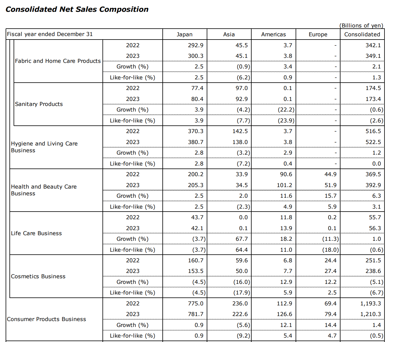 公告表示,分区域看,由于花王在中国市场的增速放缓,欧洲和中东地缘政治风险,通货膨胀导致成本上升等因素,商业状况仍不明朗。但根据零售数据和消费者购买调查,花王在日本的主要消费品市场,即包括家庭和个人护理产品、化妆品的表现较上一财年有所增长。