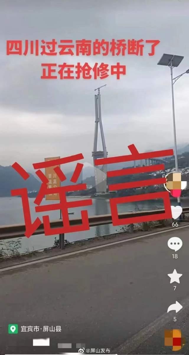 2月5日,一网民在网络平台发布视频,称“四川过云南的桥断了,正在抢修中”,引起关注。
