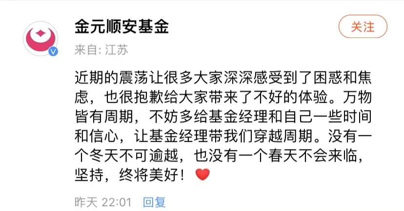 对于金元顺安产业臻选近期的净值走势,金元顺安基金2月6日回应投资者,称很抱歉给大家带来了不好的体验。“万物皆有周期,不妨多给基金经理和自己一些时间和信心,让基金经理带我们穿越周期。没有一个冬天不可逾越,也没有一个春天不会来临。”