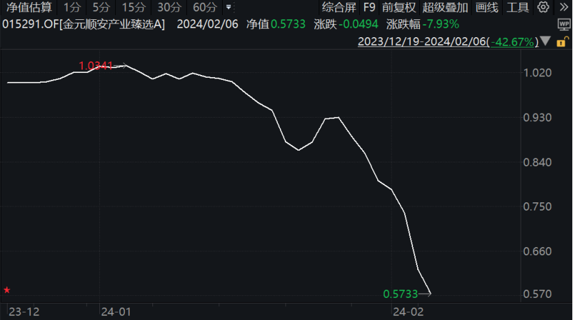 如此不忍卒视的净值曲线发生在了一只成立仅50天的新基金上。截至2月6日,曾被基民们赋予高期待值的新基金——金元顺安产业臻选净值已仅剩0.5733元。近7个交易日,该产品回撤达38.38%,年内回撤则有43.82%。该产品由金元顺安基金总经理助理、投资总监闵杭和刚晋升百亿基金经理的周博洋共同管理。其中,周博洋执掌的金元顺安优质精选曾被业内评价为“神基”——金元顺安元启的“平替”产品,在过去一年规模增长近38亿元。