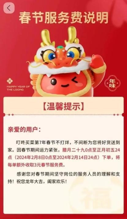 叮咚买菜公布了春节服务费说明,其中提到,“叮咚买菜第7年春节不打烊,因春节期间运力紧张,腊月二十九0点至正月初五24点(2024年2月8日0点至2024年2月14日24点)点单,将每单额外收取3元春节服务费。”