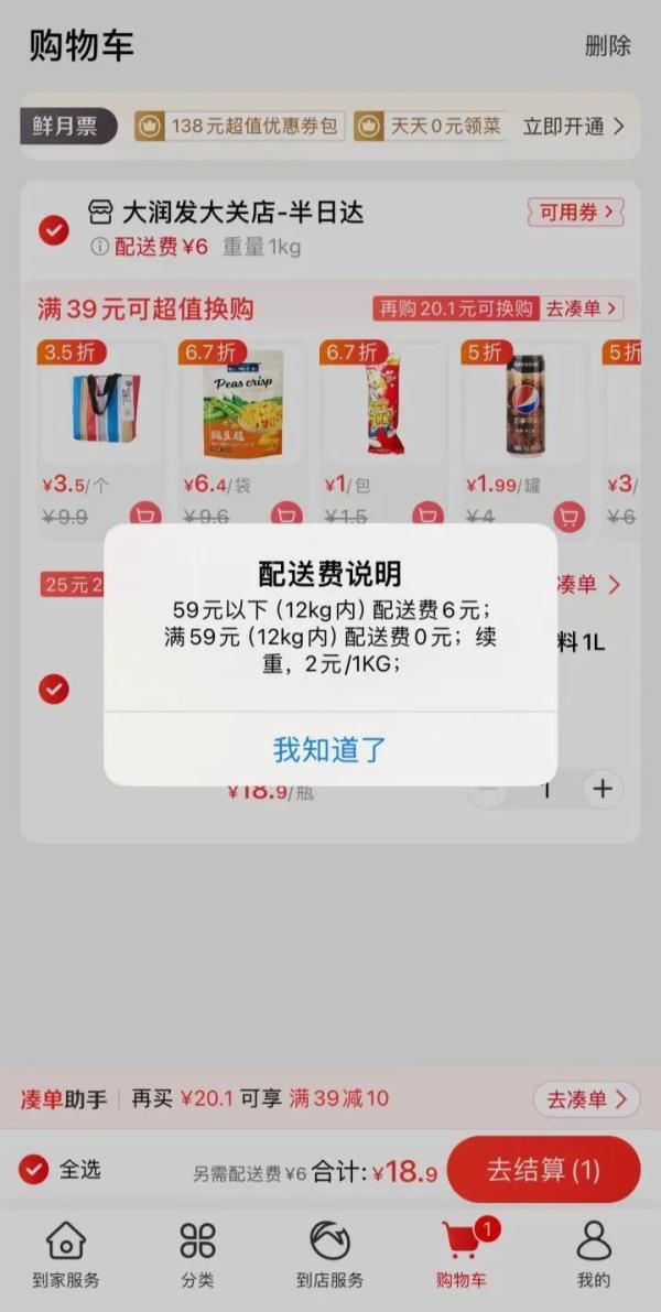 ,任意金额订单均收取6元/单运费。