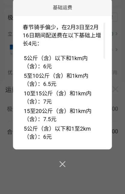 华润万家超市公布春节期间运送费调整说明,“春节骑手偏少,在2月3日至2月16日期间配送费在以下基础上增长4元。”