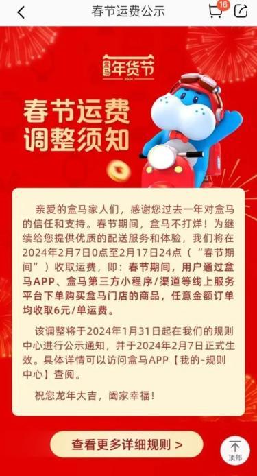 盒马鲜生表示,2月7日至2月17日期间,用户通过盒马APP、盒马第三方小程序/渠道等线上服务平台下单盒马门店商品