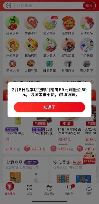 大润发App首页公布相关信息,“从2月6日起包邮门槛由59元调整至69元,给您带来不便,敬请谅解。”大润发表示,门槛上调的是“半日达”服务,“小时达”服务在春节期间运费不变。