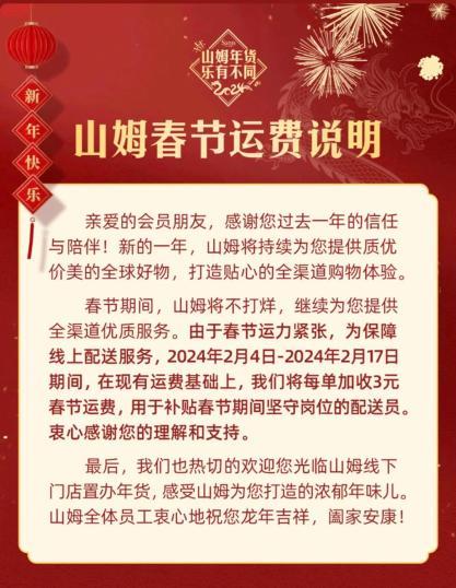 山姆表示,春节期间不打烊,2月4日至2月17日期间,在现有运费基础上,每单加收3元春节运费。