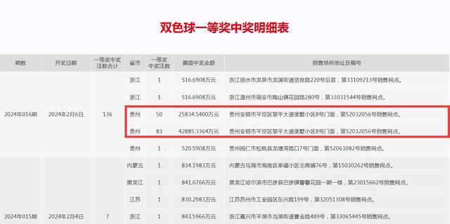 本期136注一等奖有134注来自于贵州。据中国福彩网,其中133注一等奖由一个投注站所中。中奖彩票由安顺市平坝区黎平大道堡野小区8号门面的52032056号销售网点售出,总奖金达到6.8亿多元。中国福彩网显示,在上述网点销售的两张彩票中,一张彩票一等奖中奖数量为50注,金额为25834.5400万元,另一张为中奖数量为83注,金额为42885.3364万元。