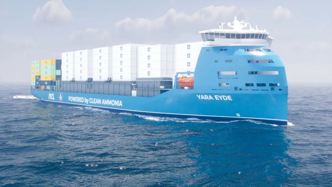 ▲全球首艘以清洁氨为燃料的集装箱船的概念图,该船预计2026年启航。