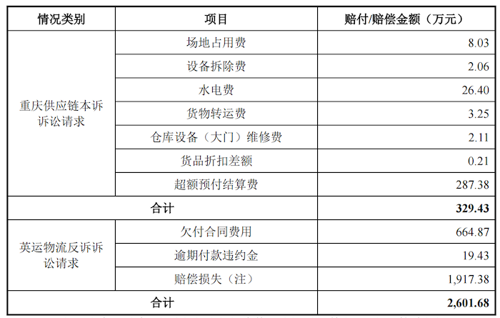 2023年2月10日,英运物流向重庆市璧山区人民法院提交了《民事反诉状》,英运物流认为其依照合同约定投入大量资金并配备人员、装配设施设备,履约期间各项KPI指标良好、产能可以满足需求,而重庆供应链长期拒绝进行KPI考核,拖欠合同费用。
