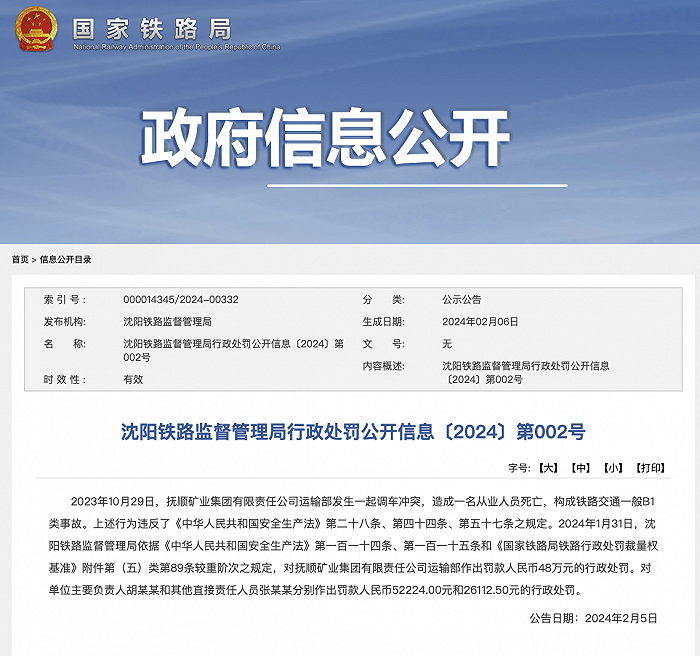 2月6日,国家铁路局网站披露,2023年10月29日,抚顺矿业集团有限责任公司运输部发生一起调车冲突,造成一名从业人员死亡,构成铁路交通一般B1类事故。上述行为违反了《中华人民共和国安全生产法》第二十八条、第四十四条、第五十七条之规定。2024年1月31日,沈阳铁路监督管理局依据《中华人民共和国安全生产法》第一百一十四条、第一百一十五条和《国家铁路局铁路行政处罚裁量权基准》附件第(五)类第89条较重阶次之规定,对抚顺矿业集团有限责任公司运输部作出罚款人民币48万元的行政处罚。对单位主要负责人胡某某和其他直接责任人员张某某分别作出罚款人民币52224.00元和26112.50元的行政处罚。