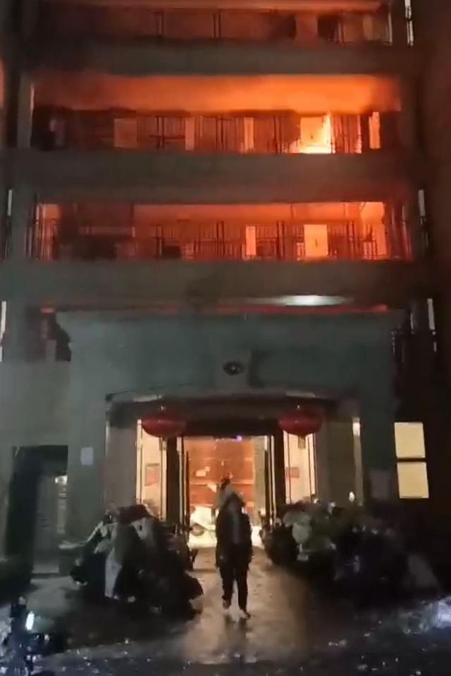 据视频显示,夜晚一小区发生火灾。从楼下往上看去,其中一层中间连廊位置明火不断燃烧。火灾发生后,消防车辆赶到现场。视频中传来有人大喊"着火了,快下来。"其中有消息称发生爆炸,并且还有消息称是燃气泄漏。