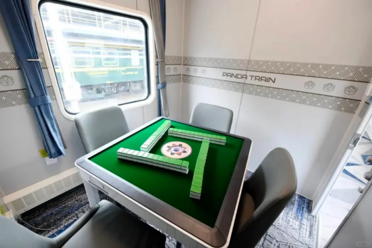 上游新闻记者从图片看到,在列车车厢一角放着一台自动麻将机,车厢墙壁上有“PANDA TRAIN”英文字样和熊猫卡通图。记者在网上检索看到该图片是“熊猫列车”推广海报之一。