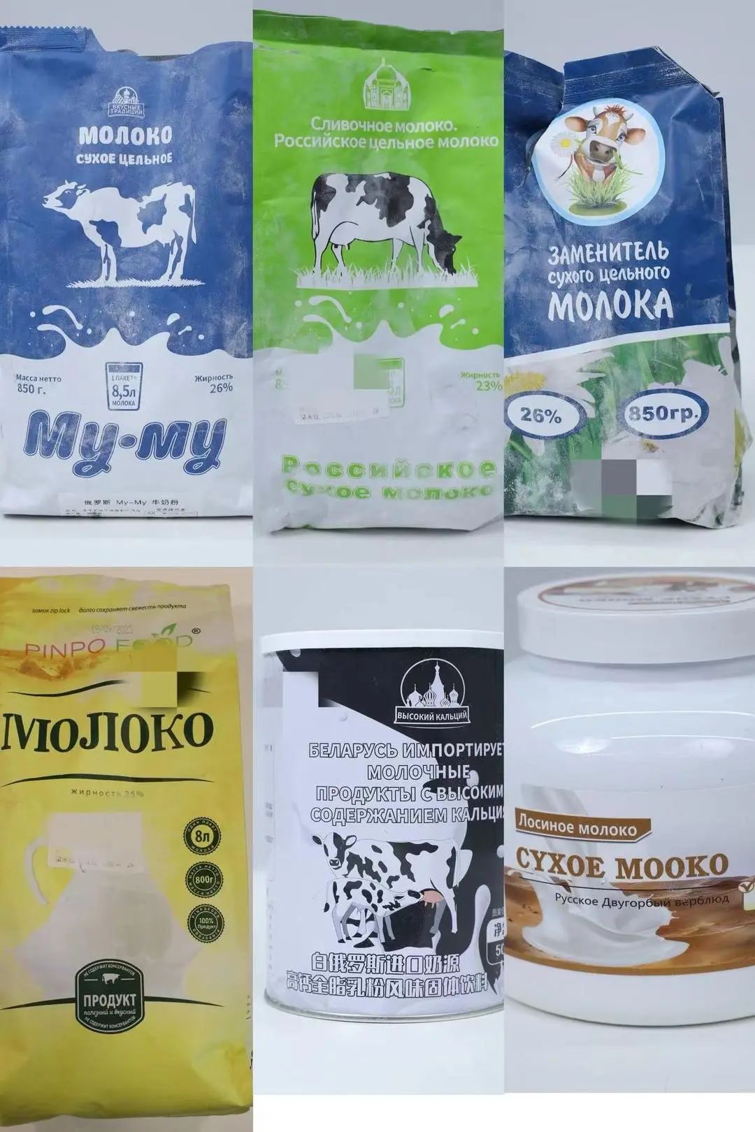 “俄罗斯My-My牛奶粉”中文标签显示,配料为“生牛乳烘干喷雾制作而成”,生产商是“俄罗斯乌拉尔斯克乳品厂”,地址为“车里宾斯克奥泽尔斯克市剧院街57号”。绿色袋装的“俄罗斯KahecTBo奶粉”和“俄罗斯阿尔泰牛奶粉”也标注了相同的生产商,地址为“车里宾斯克奥泽尔斯克市剧院街5号”。