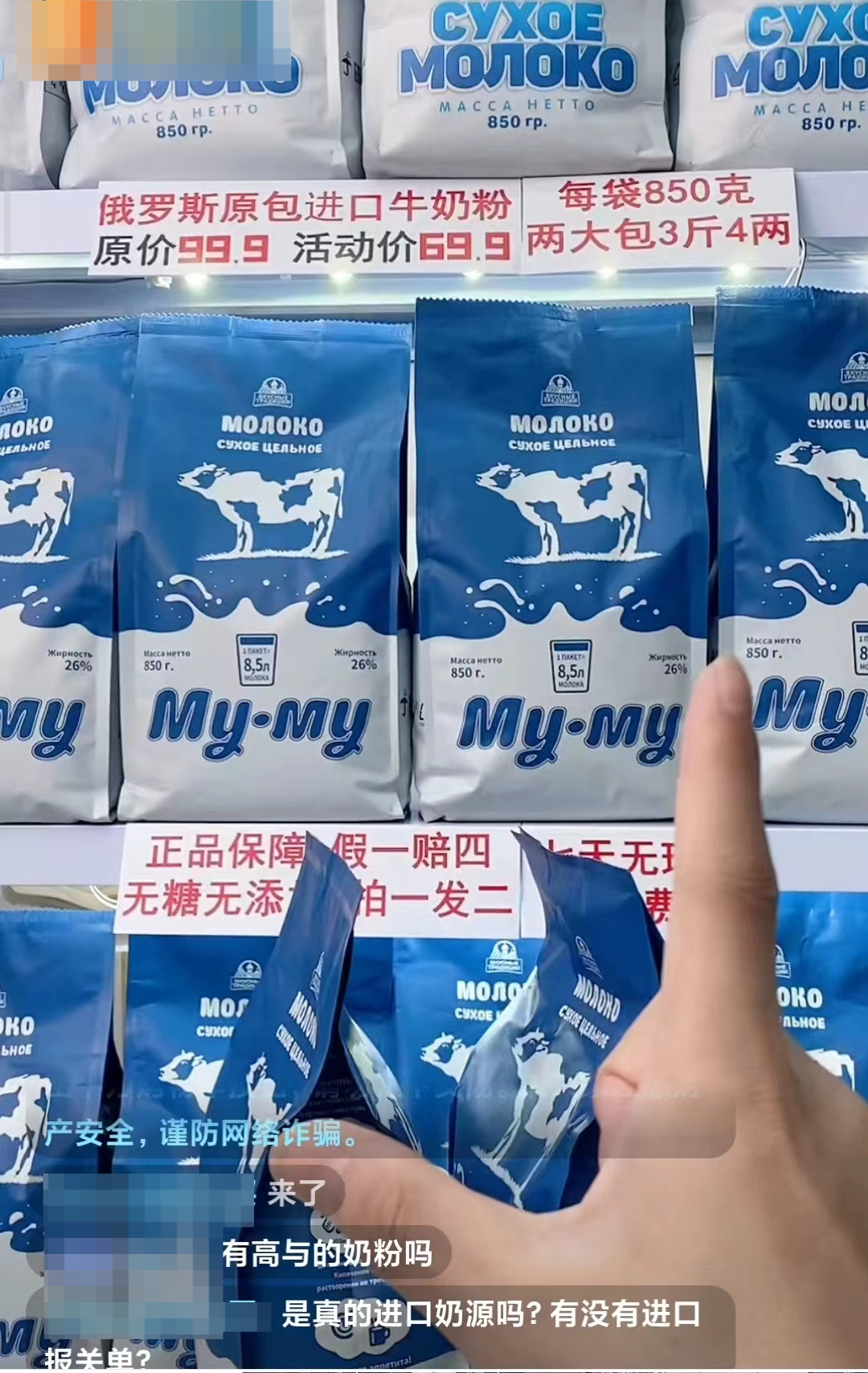 “配料只有生牛乳,46开头俄罗斯专属条形码,所见即所得,2包只要69.9元。”直播间里,蓝白色包装的“俄罗斯奶粉”摆满货架。